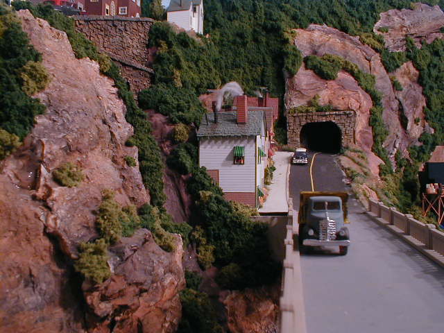 First Street crosses the concrete arched bridge. These vehicles have just come out of the tunnel from Hudson Point and are heading West. Most of these residences are used by railroad workers.